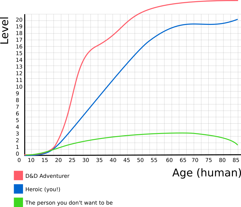 If we look over a typical human lifespan, we can make some general assumptions about leveling. For instance, for the first 15 or 20 years of life, there's probably very little leveling happening, because tabletop RPGs don't tend to start at character birth. Leveling in earnest, therefore, probably starts as a teenager or young adult. There's likely a sharp rise in leveling during university years (whether you're in university or not) because during this time, one is typically preparing for a livelihood by learning new skills. The rate of increase gradually becomes more linear, as one tackles one or two major new challenges each year, gaining legitimately specialised experience by overcoming unique obstacles in life. And finally (and ideally), one becomes near-mythic by retaining an accumulation of life experience, whilst learning new skills and wisdom by listening to the perspectives of younger peers.