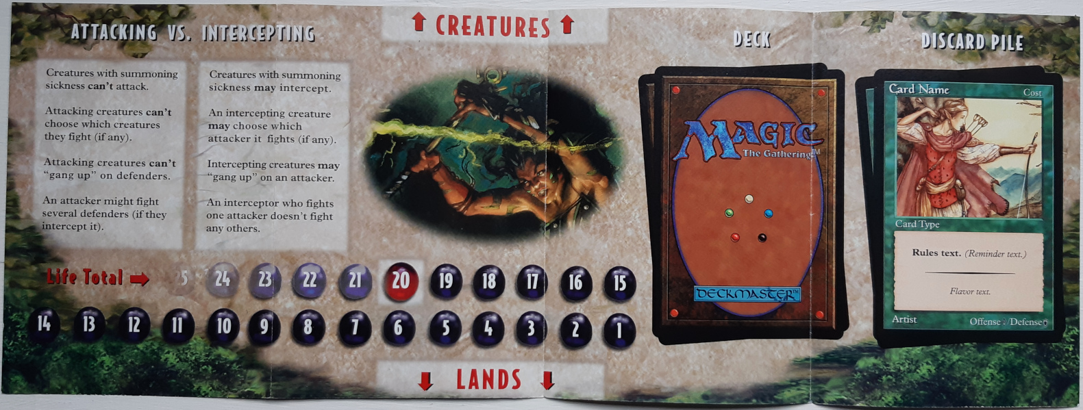The playmats included with Portal were at-a-glance cheatsheets in every respect. There was a labeled spot for your deck. There was a place for your discard pile, featuring a graphic explaining what each element on the card meant. There was a counter for your life points. Explanations in just 4 bullet points of attack and intercept mechanics. And labels to indicate where your creatures went (the battlefield in modern terminology) and where your lands went. It was a beautiful work of highly functional art, a dream come true for new players.