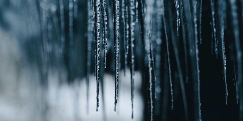 Icicles hang tenuously from the ceiling. A failed Dexterity save knocks 1d20 icicles loose. They fall to the ground and shatter, creating a frosty mist that refreezes in the nasal passages and lungs, causing 1d6 damage for 1d4 rounds until melted.