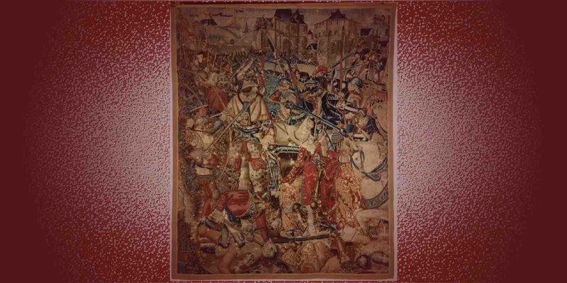 A huge tapestry of an ancient battlefield hangs on the wall. It appears to depict an army that is facing the viewer. Archers, spear men, battlefield wizards, and even siege weapons are in evidence.