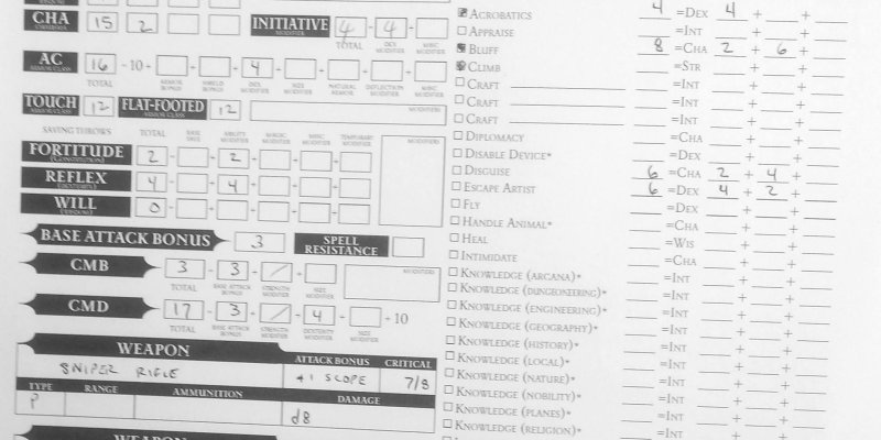 A character sheet spreadsheet based on the official Paizo Character Sheet design.